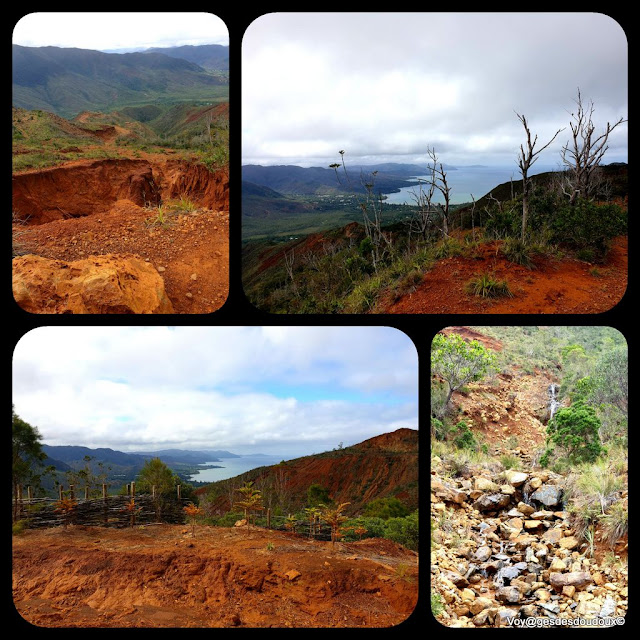 Le chemin serpente pour rejoindre un plateau où se trouve une antenne et plusieurs chemins pour continuer le tour du Mont Dore . 2h de marche sur un chemin caillouteux, qui ne fait que monter dans ce décor grandiose de terre rouge, de grandes tranchées laissées par l'exploitation minière, quelques éboulements que nous escaladons, des points de vues sur la baie de Prony. Nous croisons une dizaine de